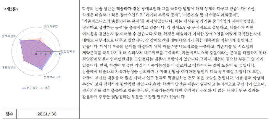 그리고 이번 경제심화&직무역량 부터는 이렇게 문제별로 점수를 평가해주고, 코멘트도 따로해줘서 어떤 부분이 내가 취약한지를 더 잘 파악할 수 있었다. 하지만, 앞에 말했듯이 코멘트는 내가 실제 작성한 답변과는 좀 차이가 있었다.